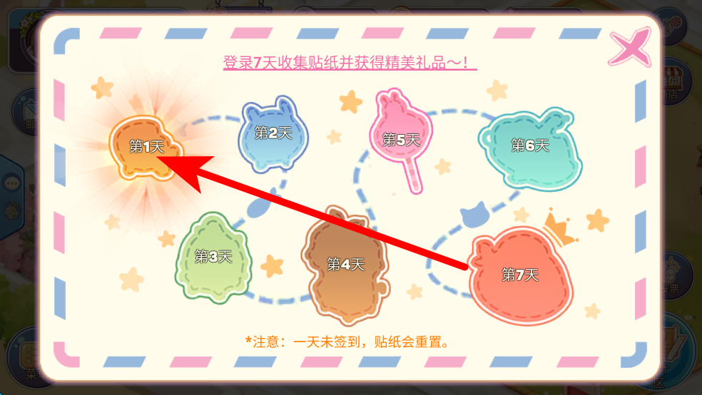 3、注意一天未簽到,貼紙會重置,需保持連續(xù)登錄,才能順利收集7天貼紙,領(lǐng)取全部獎勵,避免因中斷登錄錯失福利。