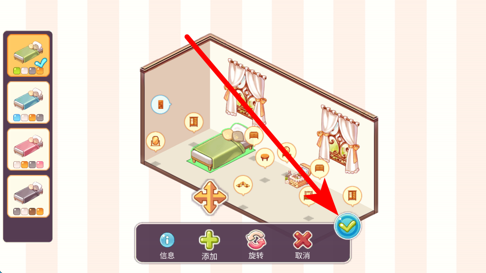 1、進(jìn)入設(shè)計(jì)區(qū)后,可在左側(cè)選擇不同風(fēng)格的家具素材,如床鋪等,點(diǎn)擊素材可將其放入房屋內(nèi)并確認(rèn)進(jìn)行擺放。