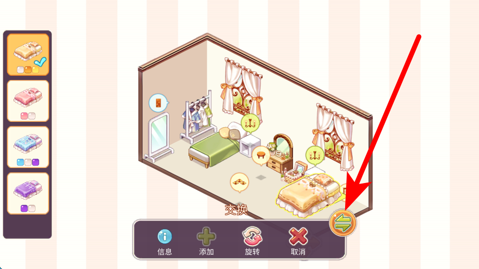 2、擺放家具時(shí),可利用交換、旋轉(zhuǎn)功能調(diào)整其位置與角度,打造心儀的布局,還能添加新家具豐富房屋內(nèi)容。