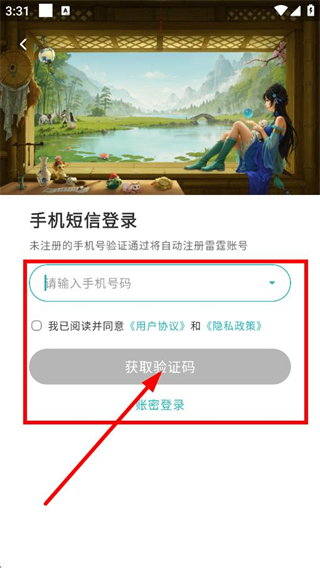 3、選擇手機短信登錄,輸入手機號碼,點擊獲取驗證碼。