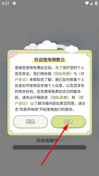 1、在歡迎使用倒數(shù)日的彈窗中,點(diǎn)擊同意,進(jìn)入APP首頁。
