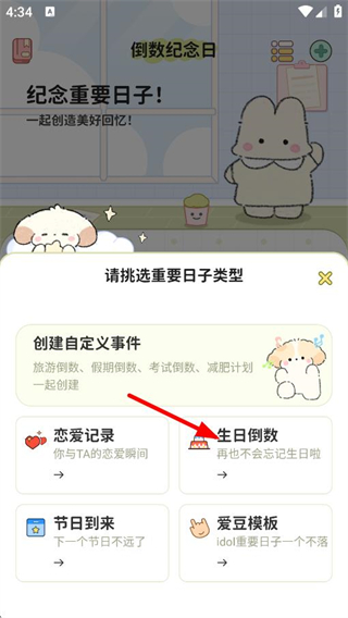 3、在重要日子類型選擇頁面,點(diǎn)擊生日倒數(shù),進(jìn)入生日倒數(shù)設(shè)置頁面。