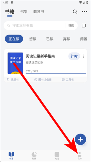1、打開閱讀記錄,點(diǎn)擊底部導(dǎo)航欄最右側(cè)的我的,進(jìn)入個(gè)人中心頁面。