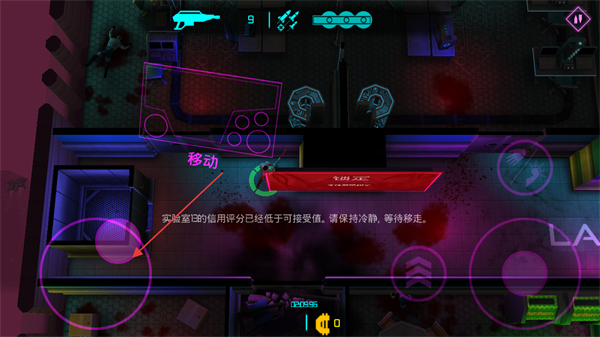 1、通過(guò)左側(cè)移動(dòng)按鈕操控角色移動(dòng),注意實(shí)驗(yàn)室信用評(píng)分提示,保持冷靜等待移走。