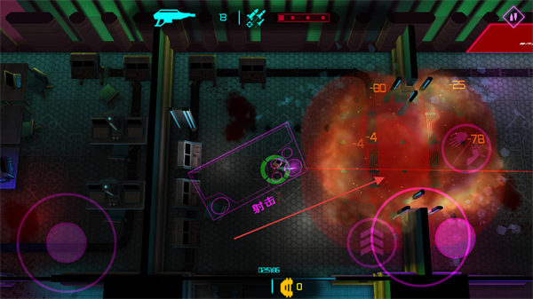 2、點(diǎn)擊射擊按鈕攻擊敵人,利用武器造成范圍傷害,消滅沿途敵人。