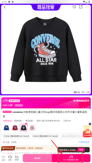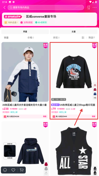 3、在專場頁面,找到目標(biāo)童裝衛(wèi)衣商品條目,點(diǎn)擊進(jìn)入商品詳情頁。