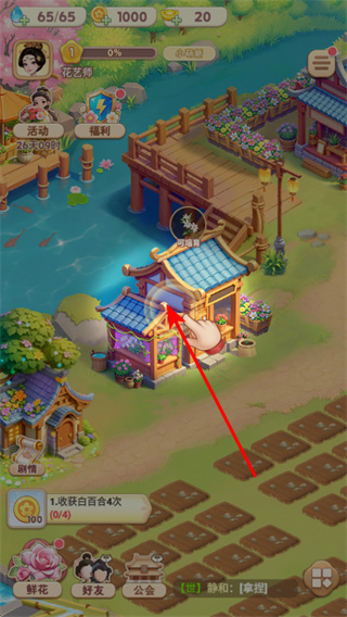 3、在主場(chǎng)景中,點(diǎn)擊鮮花培育建筑,這是進(jìn)入培育界面的核心操作,進(jìn)入后可開(kāi)展鮮花種植、培育等一系列玩法,推進(jìn)游戲進(jìn)程。