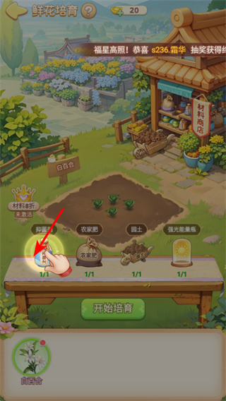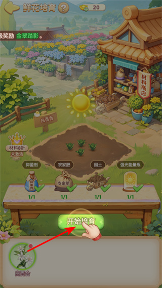 1、完成材料準(zhǔn)備后,點(diǎn)擊開(kāi)始培育按鈕,這是啟動(dòng)鮮花培育流程的核心操作,啟動(dòng)后需等待培育時(shí)間結(jié)束,即可收獲鮮花或種子。