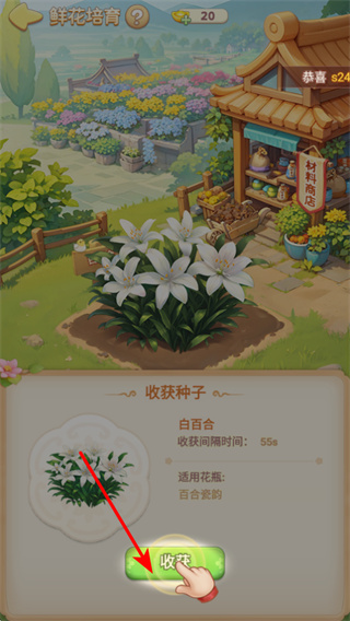 4、進(jìn)入鮮花培育界面后,點(diǎn)擊收獲按鈕,這是獲取鮮花種子的關(guān)鍵操作,需在收獲間隔時(shí)間結(jié)束后準(zhǔn)確點(diǎn)擊,獲取種子用于后續(xù)培育。