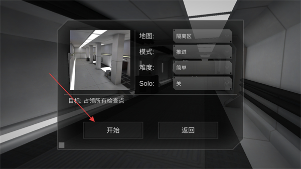 1、選擇地圖如隔離區(qū)、模式推進(jìn)、難度簡(jiǎn)單等,點(diǎn)擊開始進(jìn)入游戲,目標(biāo)占領(lǐng)所有檢查點(diǎn)。