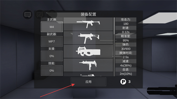 2、在裝備配置界面,選擇主武器如M4、副武器如MP7等,點(diǎn)擊應(yīng)用裝備武器。