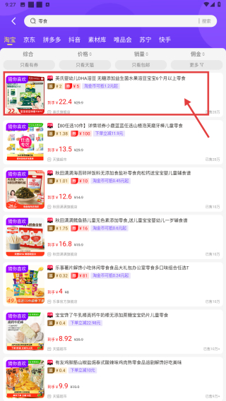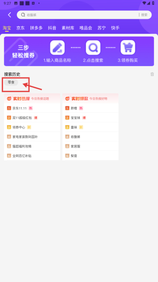 2、在優(yōu)惠頁面的搜索歷史中,點(diǎn)擊零食選項(xiàng),瀏覽零食商品列表。
