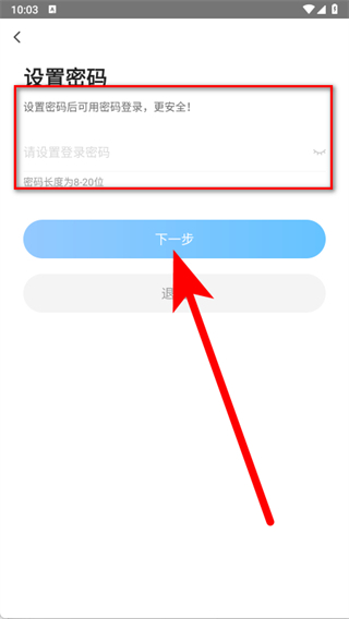 4、進入登錄后,設(shè)置登錄密碼,點擊下一步,完成注冊。
