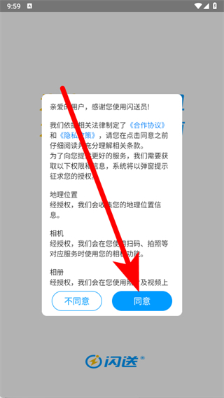 1、打開閃送員,在協(xié)議彈窗中點擊同意,確認閱讀并同意相關(guān)協(xié)議。