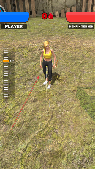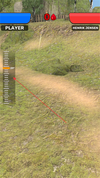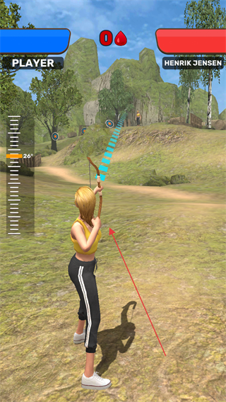 1、操控角色拉開(kāi)弓箭,調(diào)整左側(cè)角度刻度,瞄準(zhǔn)敵方目標(biāo)。