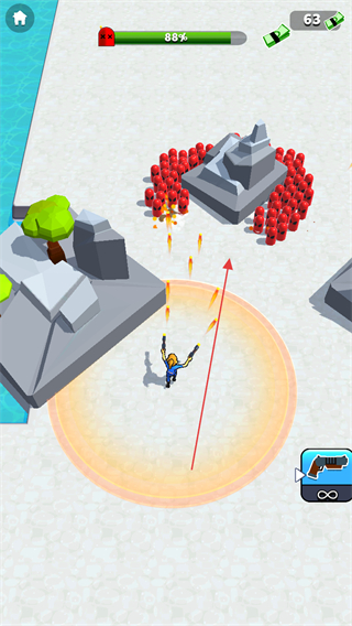 1、操控角色移動,接近紅色敵人集群時會自動射擊,消滅敵人以推進關(guān)卡進度如進度條從54%到88%再到100%。