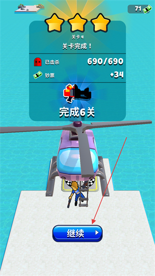 4、到達停機坪后,關(guān)卡完成,可查看已擊殺敵人數(shù)量、獲得的鈔票等信息,點擊繼續(xù)進入下一關(guān),繼續(xù)挑戰(zhàn)。