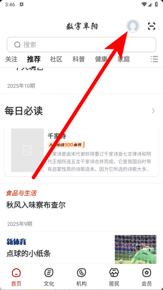 1、打開數(shù)字阜陽(yáng),點(diǎn)擊頁(yè)面右上角個(gè)人圖標(biāo),進(jìn)入個(gè)人中心頁(yè)面。