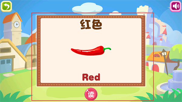 3、在認顏色環(huán)節(jié),可學習顏色知識,如認識紅色Red,點擊讀可進行讀音學習。