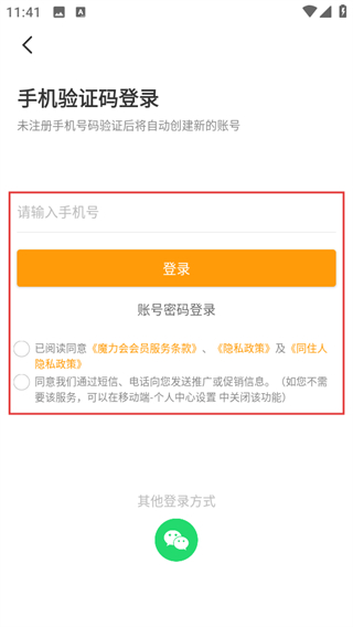 3、在登錄選擇頁(yè)面,輸入手機(jī)號(hào),同意協(xié)議后點(diǎn)擊登錄可完成賬號(hào)登錄。