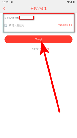4、輸入手機號后,點擊下一步,進入手機號驗證環(huán)節(jié)。
