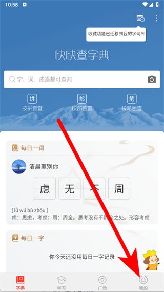 1、打開快快查漢語字典,點擊底部導航欄我的,進入個人中心頁面。