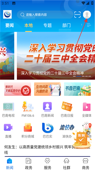 1、打開(kāi)看巴南,點(diǎn)擊頁(yè)面右上角的個(gè)人圖標(biāo),可進(jìn)入個(gè)人中心頁(yè)面。
