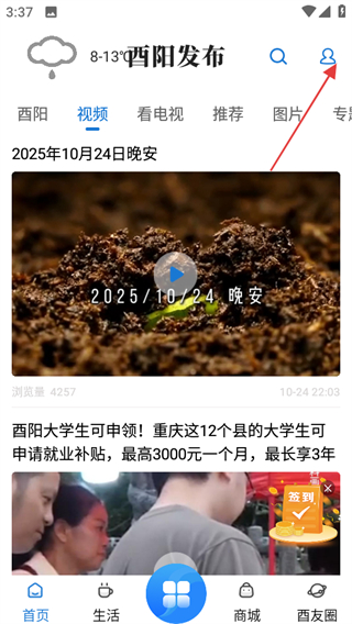 1、打開酉陽(yáng)發(fā)布,點(diǎn)擊頁(yè)面右上角的個(gè)人圖標(biāo),可進(jìn)入個(gè)人中心頁(yè)面。