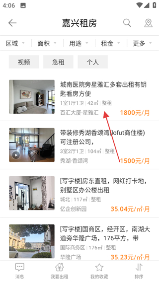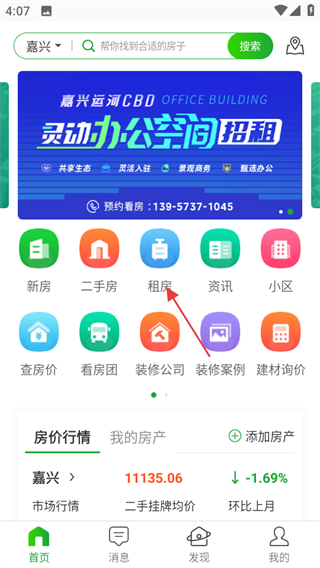 1、打開(kāi)房產(chǎn)超市,點(diǎn)擊租房選項(xiàng),可進(jìn)入嘉興租房列表頁(yè)面。