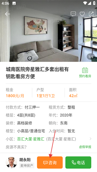 3、在房源詳情頁(yè)面,點(diǎn)擊咨詢(xún)可進(jìn)入與房東的聊天頁(yè)面。