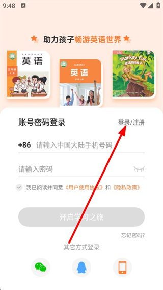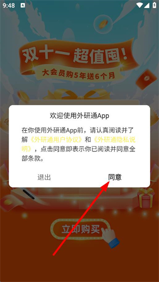 1、在歡迎使用外研通App彈窗中,點擊同意,進入頁面。