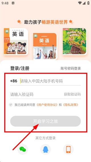 3、輸入中國大陸手機號碼,并輸入驗證碼,點擊開啟學(xué)習(xí)之旅,完成賬號登錄。