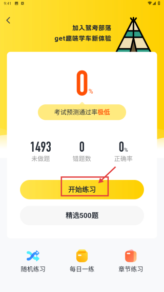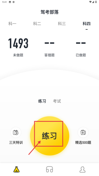 2、在科四練習(xí)頁面,點擊練習(xí)按鈕,彈出加入駕考部落提示頁。