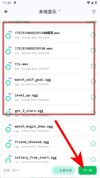 2、在本地音樂列表,選擇需要轉(zhuǎn)換的音頻文件,點(diǎn)擊下一步,進(jìn)入音頻轉(zhuǎn)換設(shè)置頁面。