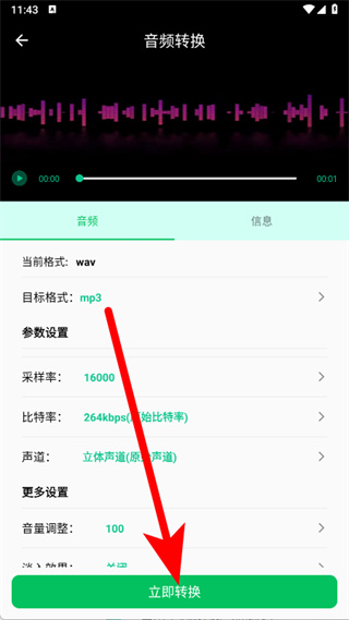 3、在音頻轉(zhuǎn)換頁面,確認(rèn)目標(biāo)格式、采樣率等參數(shù)后,點(diǎn)擊立即轉(zhuǎn)換按鈕,開始音頻格式轉(zhuǎn)換。