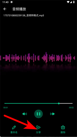 4、轉(zhuǎn)換完成后,可在音頻播放頁面,點(diǎn)擊分享按鈕,將轉(zhuǎn)換后的音頻文件分享給他人。
