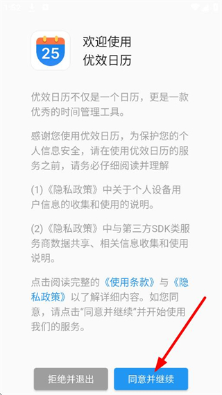 1、在歡迎使用優(yōu)效日歷頁面,點(diǎn)擊同意并繼續(xù),進(jìn)入日歷首頁。