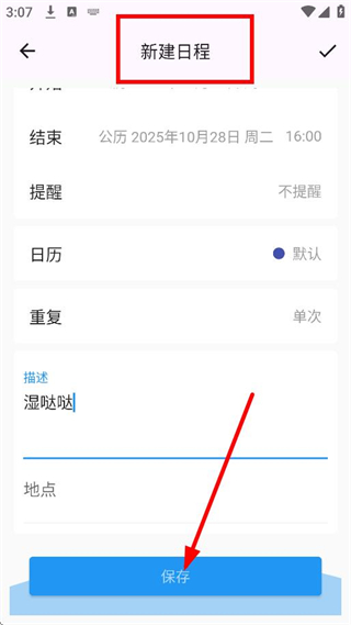 3、在新建日程頁面,填寫日程描述等信息后,點(diǎn)擊保存,完成日程創(chuàng)建。