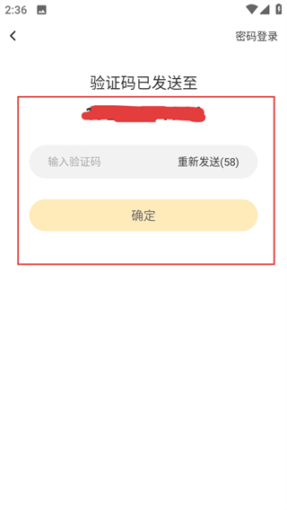 4、在驗(yàn)證碼輸入頁面,輸入收到的驗(yàn)證碼后點(diǎn)擊確定可完成賬號登錄。