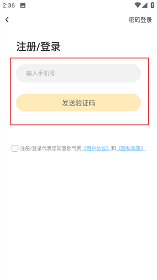 3、在注冊登錄操作頁面,輸入手機(jī)號并點(diǎn)擊發(fā)送驗(yàn)證碼。