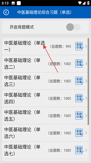 4、在單選題集選擇頁面,點擊中醫(yī)基礎(chǔ)理論單選一可進(jìn)入該題集的答題頁面。