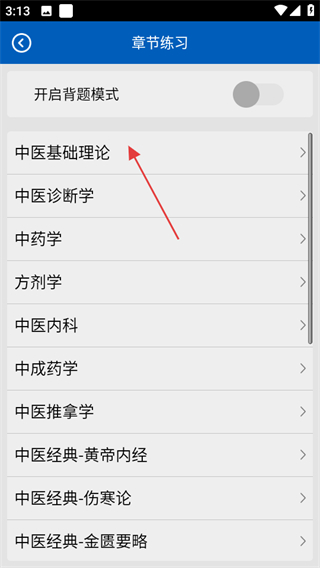 2、在章節(jié)練習(xí)選擇頁面,點擊中醫(yī)基礎(chǔ)理論可進(jìn)入中醫(yī)基礎(chǔ)理論習(xí)題選擇頁面。