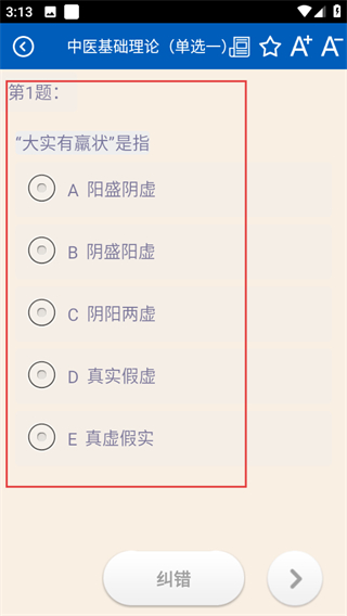 5、在答題頁面,可查看并選擇中醫(yī)基礎(chǔ)理論單選題答案,如大實有羸狀題目。