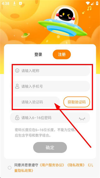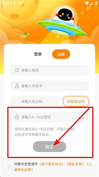 4、在注冊信息填寫頁面,輸入符合要求的密碼后點(diǎn)擊確定,完成賬號注冊。