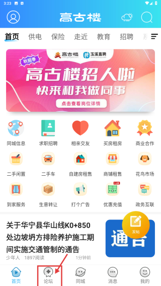 1、打開本地生活類應用,點擊底部論壇選項,進入社區(qū)頁面。
