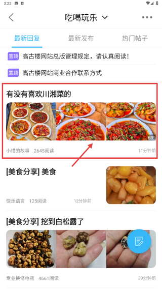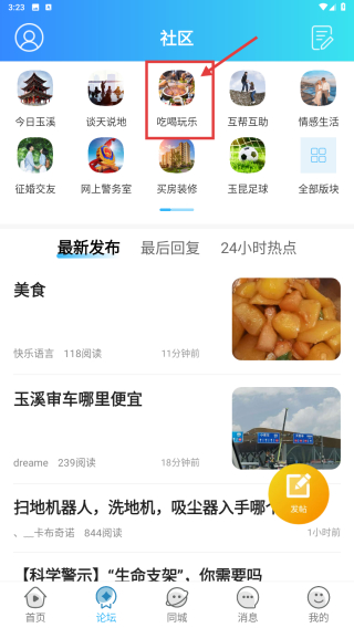 2、在社區(qū)頁面,點擊吃喝玩樂板塊選項,瀏覽該板塊下的帖子列表。