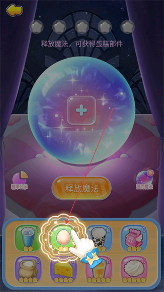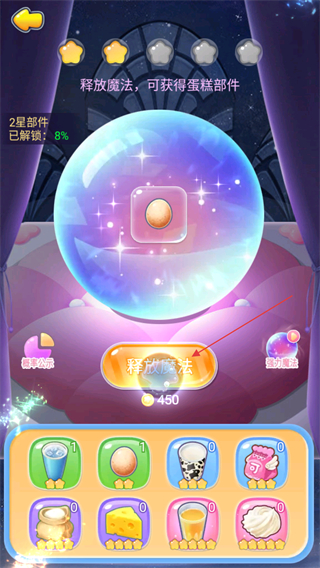 4、點(diǎn)擊釋放魔法按鈕,消耗資源制作蛋糕部件,解鎖不同星級(jí)的部件以提升蛋糕品質(zhì),推進(jìn)游戲進(jìn)程。
