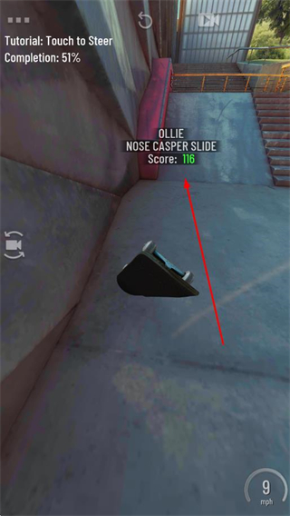 3、按照教程提示,完成ollie、nose casper slide等特技動(dòng)作,每個(gè)動(dòng)作都有相應(yīng)的分?jǐn)?shù),完成動(dòng)作,提升教程完成度。