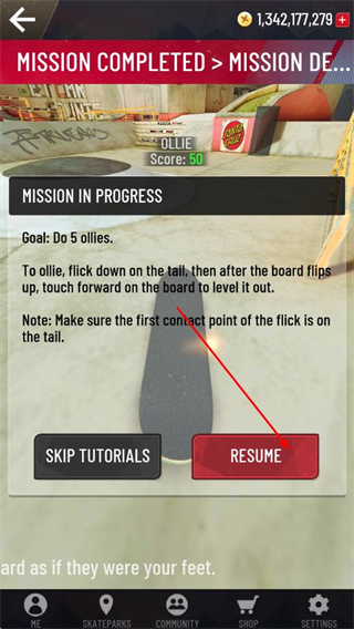 1、點(diǎn)擊RESUME,進(jìn)入游戲教程或滑板場(chǎng)景,開(kāi)始學(xué)習(xí)滑板操作。