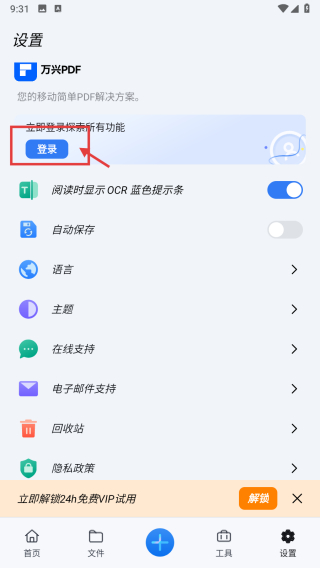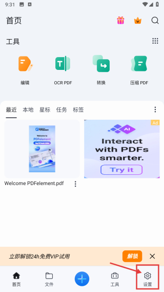 1、打開PDF處理類應用,點擊底部設置選項,進入設置頁面。